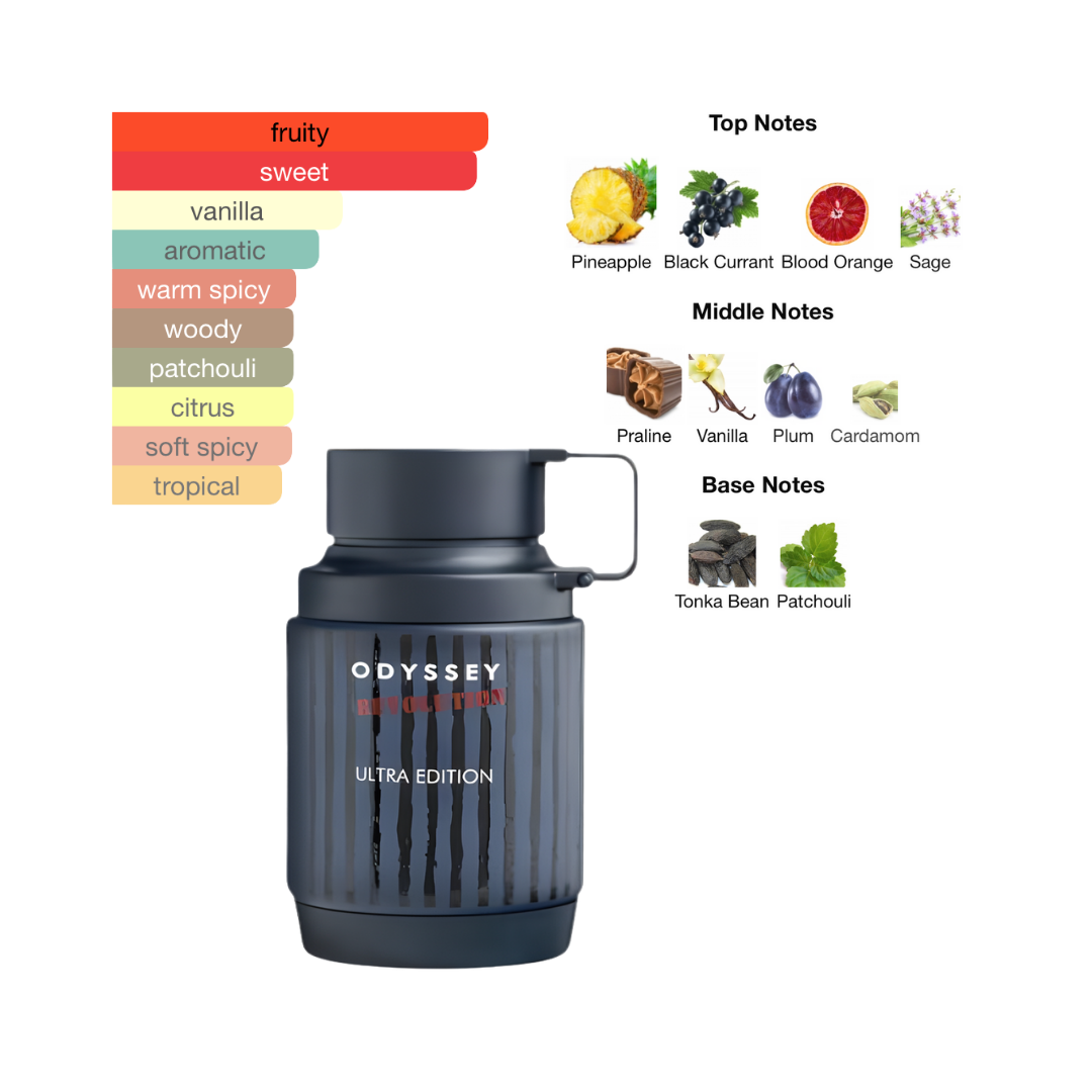 Odyssey Revolution by Armaf is a men’s fragrance, released in 2025. It belongs to the Aromatic Fruity aromatic family, offering a fresh, vibrant and modern character ideal for everyday and casual wear.