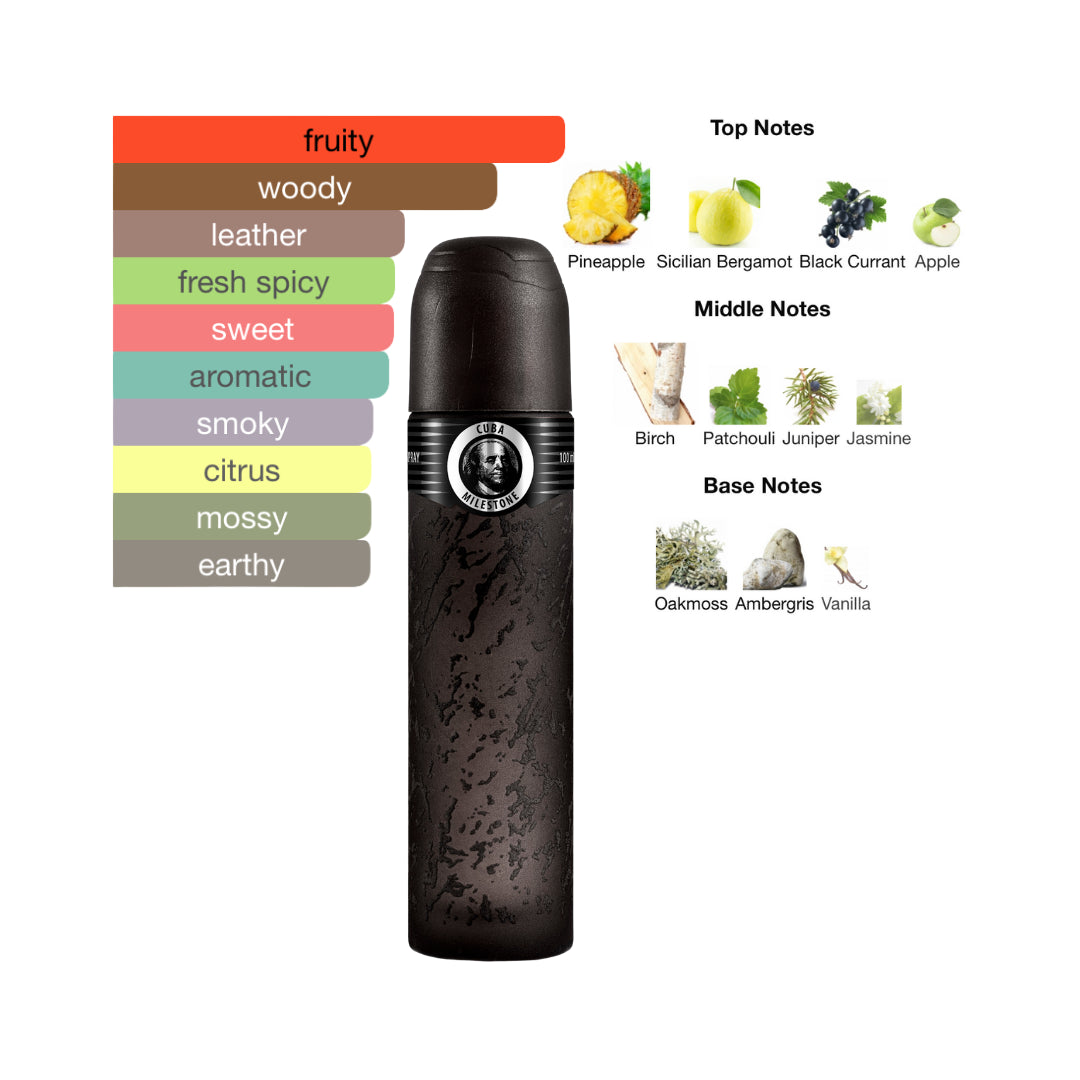 Cuba Milestone by Cuba Paris is a men’s fragrance, released in 2020. It belongs to the Aromatic Green aromatic family, offering a fresh, adventurous, and sophisticated character. It balances a vibrant and fruity opening with a woody heart and a smooth, earthy base, making it ideal for daily wear and casual outings.