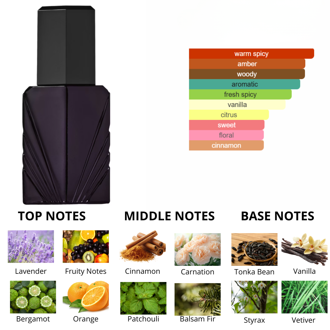 Middle notes: cinnamon, carnation, nutmeg, sandalwood, patchouli, balsam fir, cedar, jasmine and geranium.