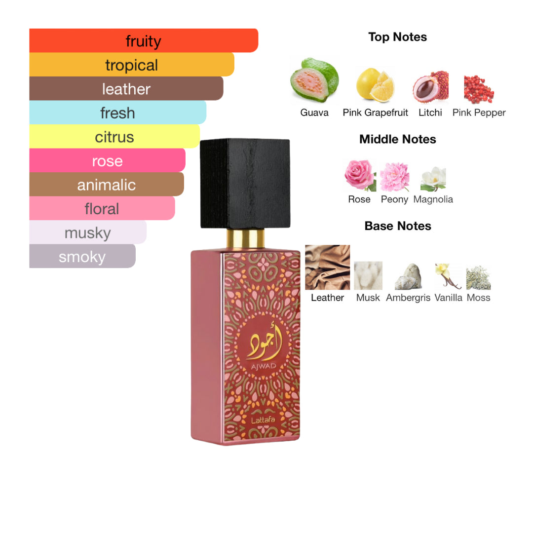 Ajwad Pink to Pink by Lattafa Perfumes is a unisex fragrance, launched in 2024. It is a Floral Fruity fragrance with a bold, creative edge, known for its realistic guava opening and a sophisticated leathery dry-down. It is a versatile choice for fall, spring, and summer, performing well during both the day and night.