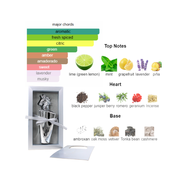 Main accords: Aromatic; Fresh Spicy; Citrus; Green; Woody; Amber; Sweet; Lavender; Musky