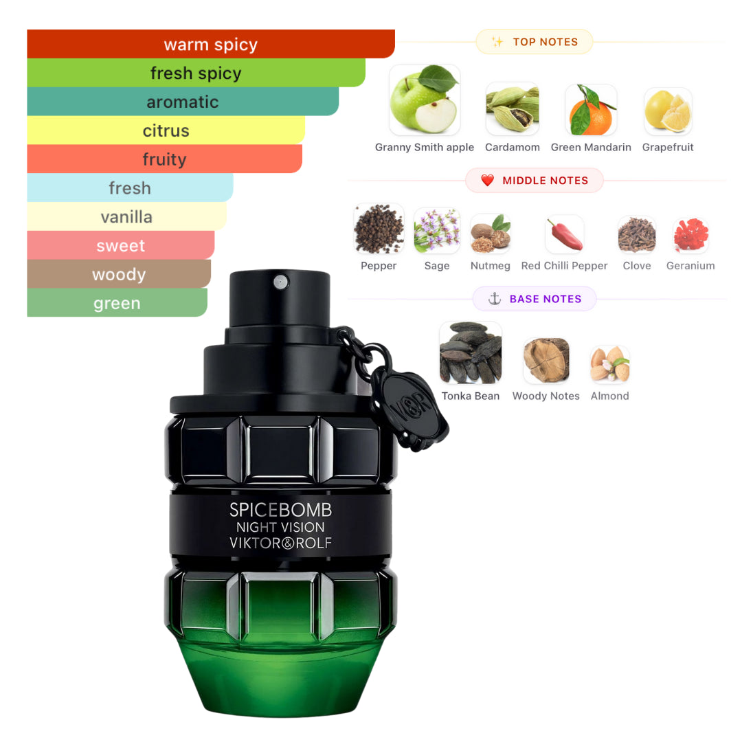 Spicebomb Night Vision Eau de Toilette by Viktor & Rolf is a men’s fragrance, released in 2019, created by Nathalie Lorson & Pierre Negrin. It belongs to the Oriental Fougere aromatic family, offering a bold, warm